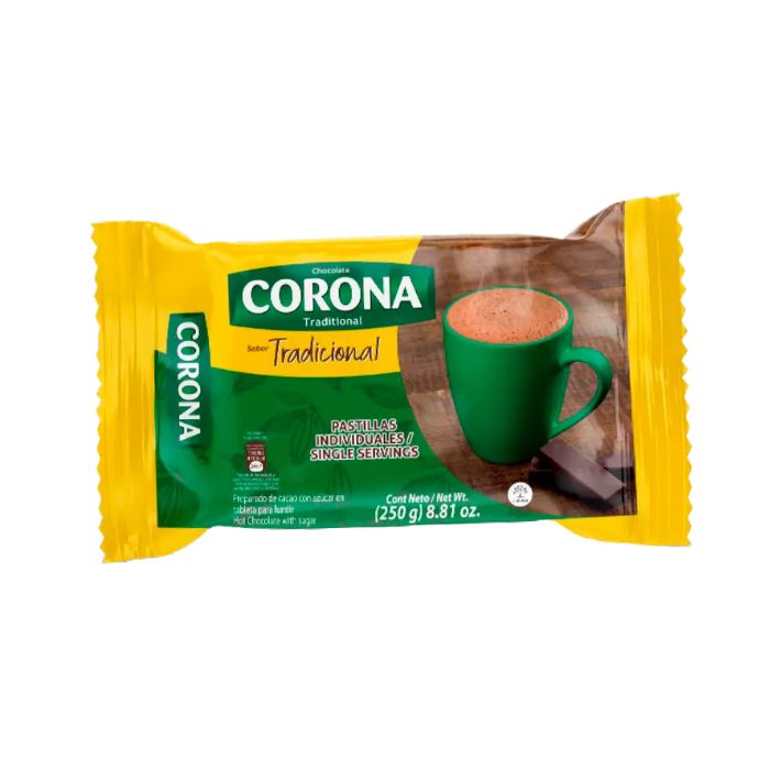 Chocolate a la taza de la marca Corona en formato tableta de 250g es un preparado de cacao con azúcar en tableta para fundir.